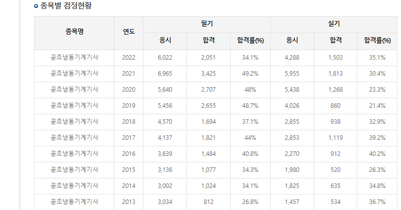 2013년부터 2022년까지 10년간의 응시자수, 합격자수 및 합격률이 적혀있는데요. 응시자수는 계속해서 상승하는 추세를 보이고 있습니다.