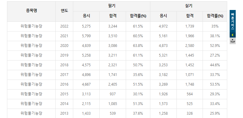 실기시험 합격률은 편차가 있습니다. 때론 50% 이상을 기록하기도 하지만, 평상시엔 30%를 약간 넘습니다. 새로운 유형의 문제가 나오거나, 위험물 관련 법규가 개정되는 등의 변수가 존재한다고 할 수 있습니다. 가장 높았던 합격률은 2016년도에 기록한 53.5%입니다. 주요 합격률은 아래와 같습니다.