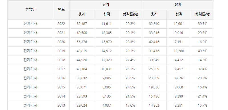 전기기사의 최근 10년 합격률과 난이도입니다.