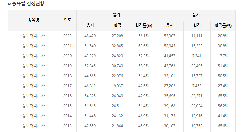 정보처리기사의 최근 10년치 합격률 통계입니다.