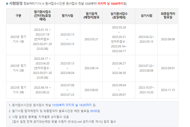 2023년도 정보처리기사 시험은 1,2,3회차에 실시합니다.